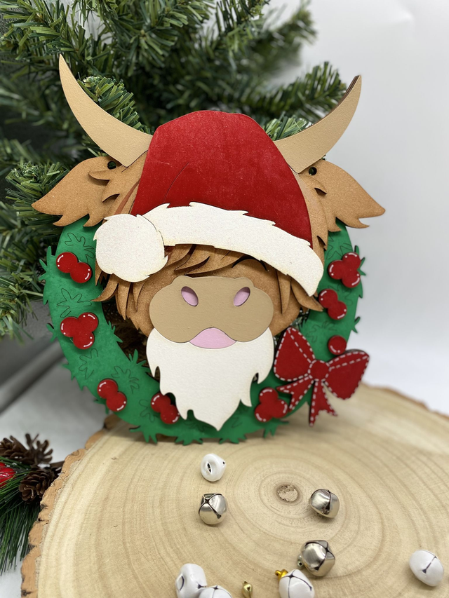 Hanging Highland Cow with Christmas Wreath