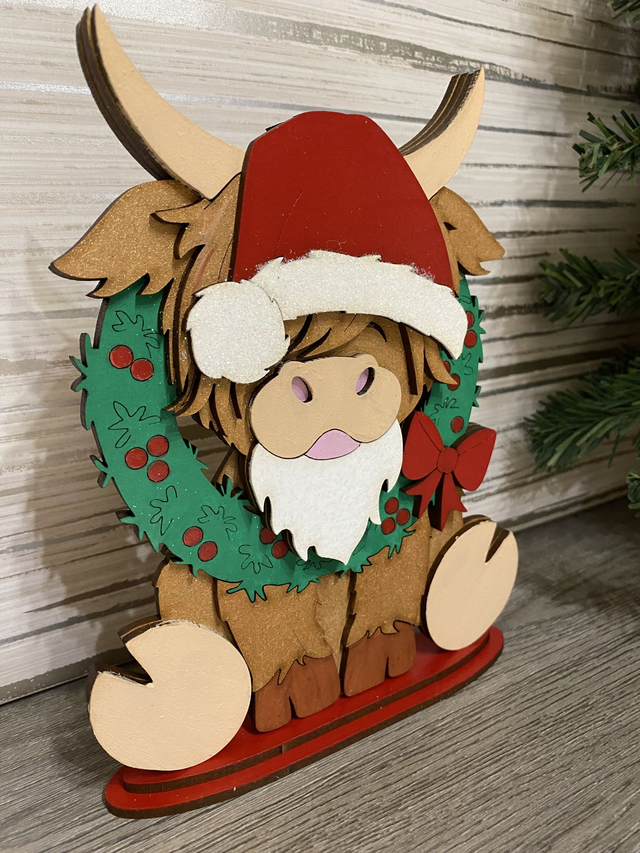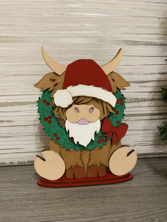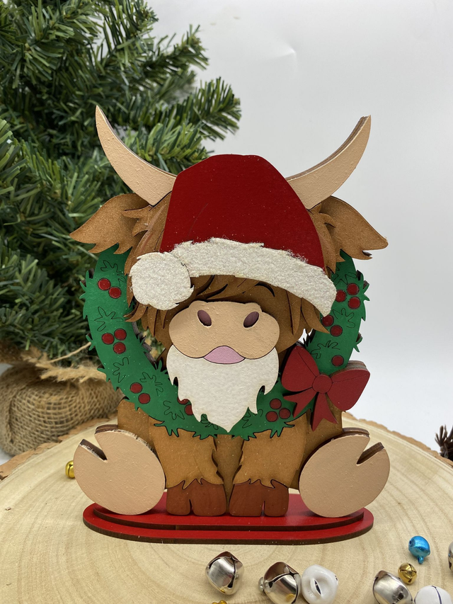 Sitting Highland Cow with Christmas wreath - Measures 21cm tall