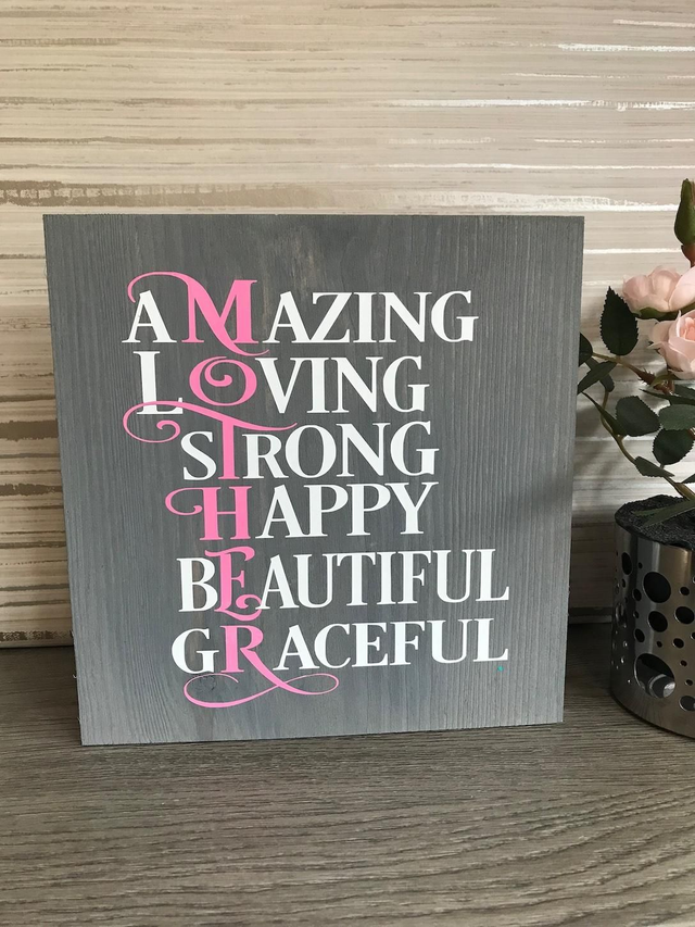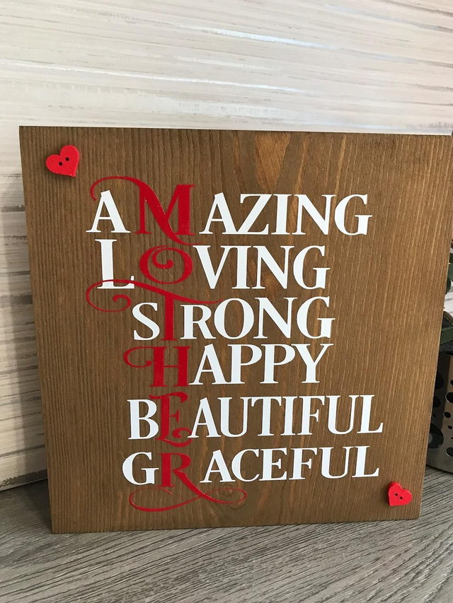 Solid wood freestanding block in either oak or driftwood grey. Measures 20x20cm. Wording applied with white permanent matt vinyl and the wording Mother in red.